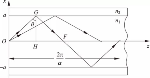 我們在圖6的階躍折射率多模光纖中選取光線OGF進行分析,假定它的空間周期也為2π/α,則有